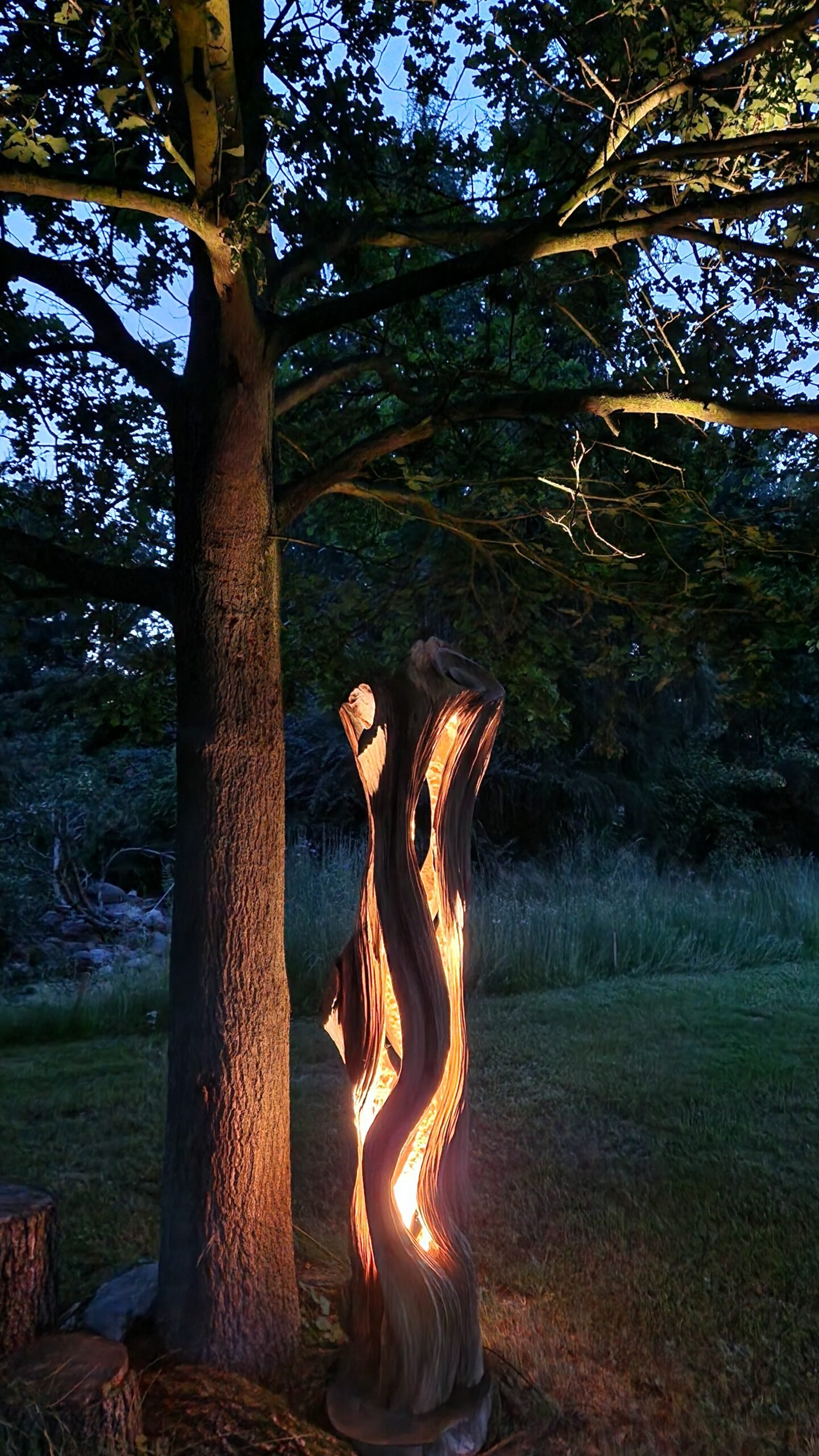 Wewnętrzne podświetlenie subtelnie wydobywa strukturę drewna, tworząc magiczną grę światła i cienia – idealną do nastrojowego oświetlenia salonu, ogrodu zimowego czy tarasu.